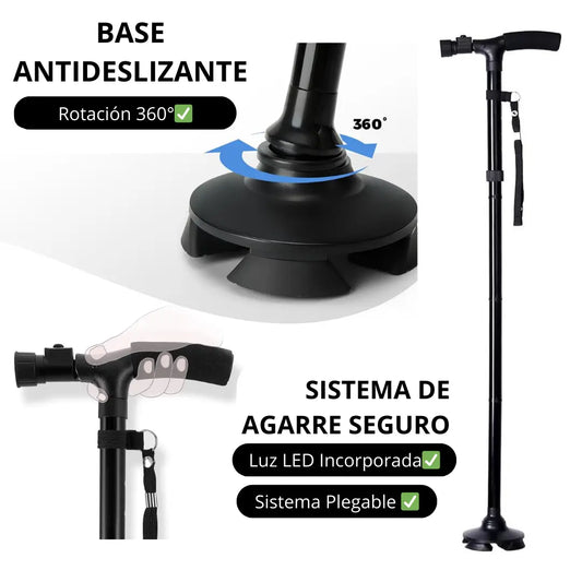 BASTÓN PLEGABLE 360° - Incluye Luz LED y 4 Apoyos Antideslizantes para mayor Estabilidad y Seguridad